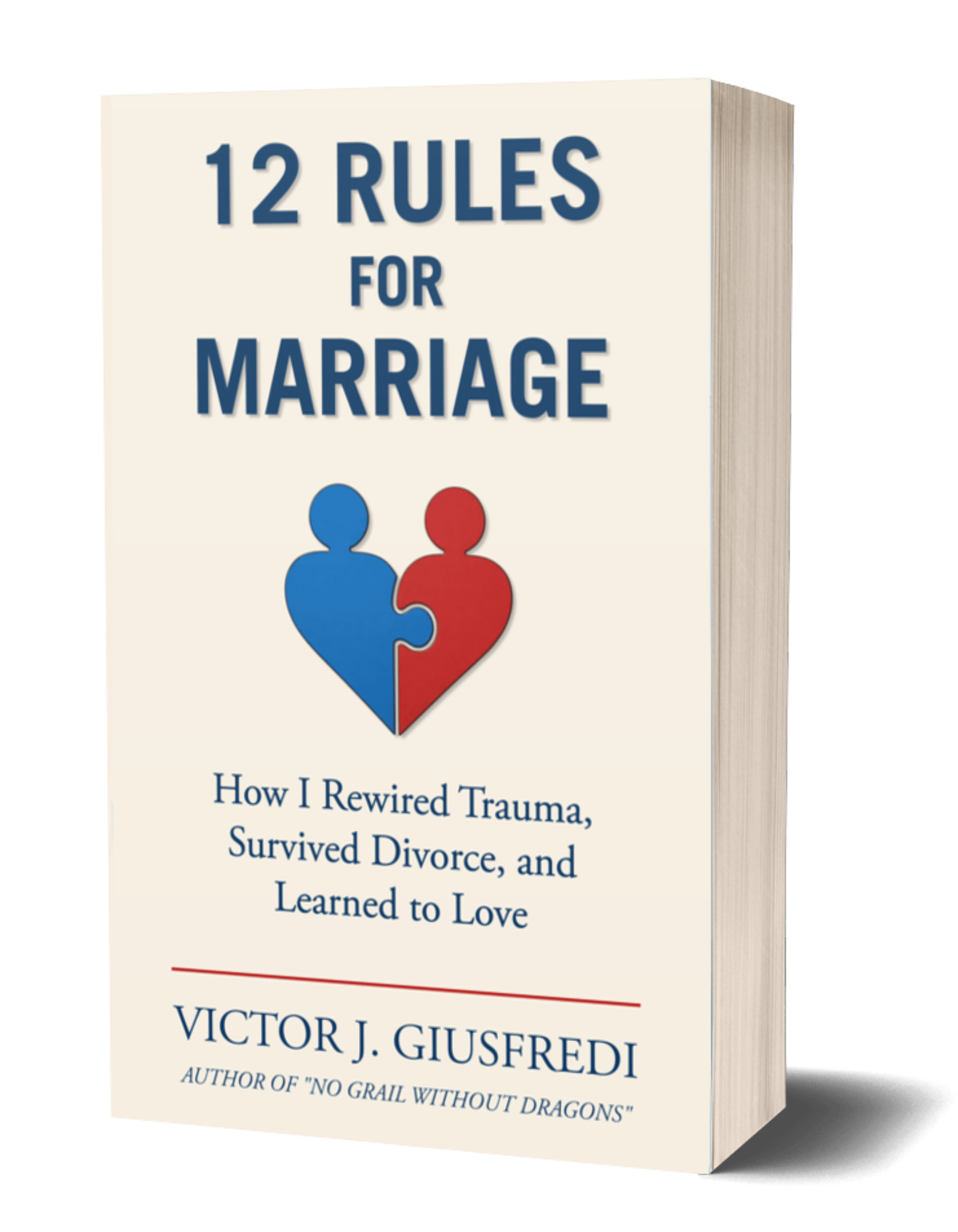 This inspiring practical memoir provides a step-by-step approach to building a happier marriage from the inside out. 12 Rules for Marriage tells the story of Victor Giusfredi, a twice-divorced young man forced to confront his own blindspots to recover from devastating relationship failures, escape the claws of trauma triggers, and rebuild his romantic life. He embarks on a life-changing journey of personal transformation, where he learns powerful, wise, and practical strategies that help us to: